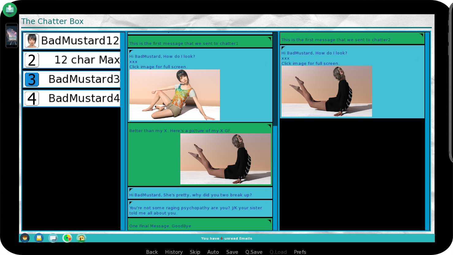 - A computer screen with e-mail, a relay for phone chat messages, web browser, and its own chat(not live)